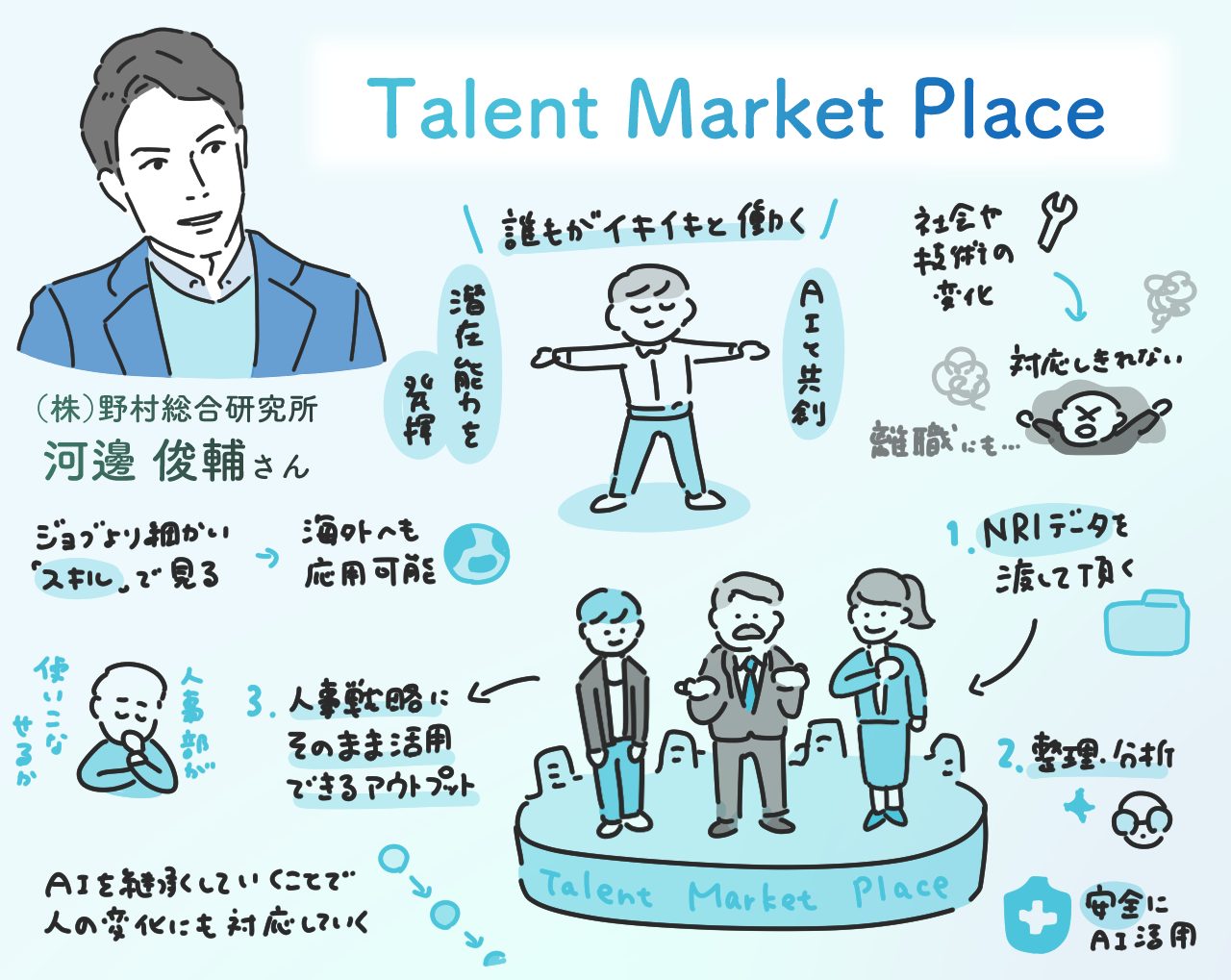 NRIの新規事業『Talent Market Place』は、生成AIを活用して「企業内で実行される業務」と「人材の意志・能力」を可視化したバーチャルな「社内人材市場」を形成し、業務と人材の最適なマッチングを実現するシステムです。