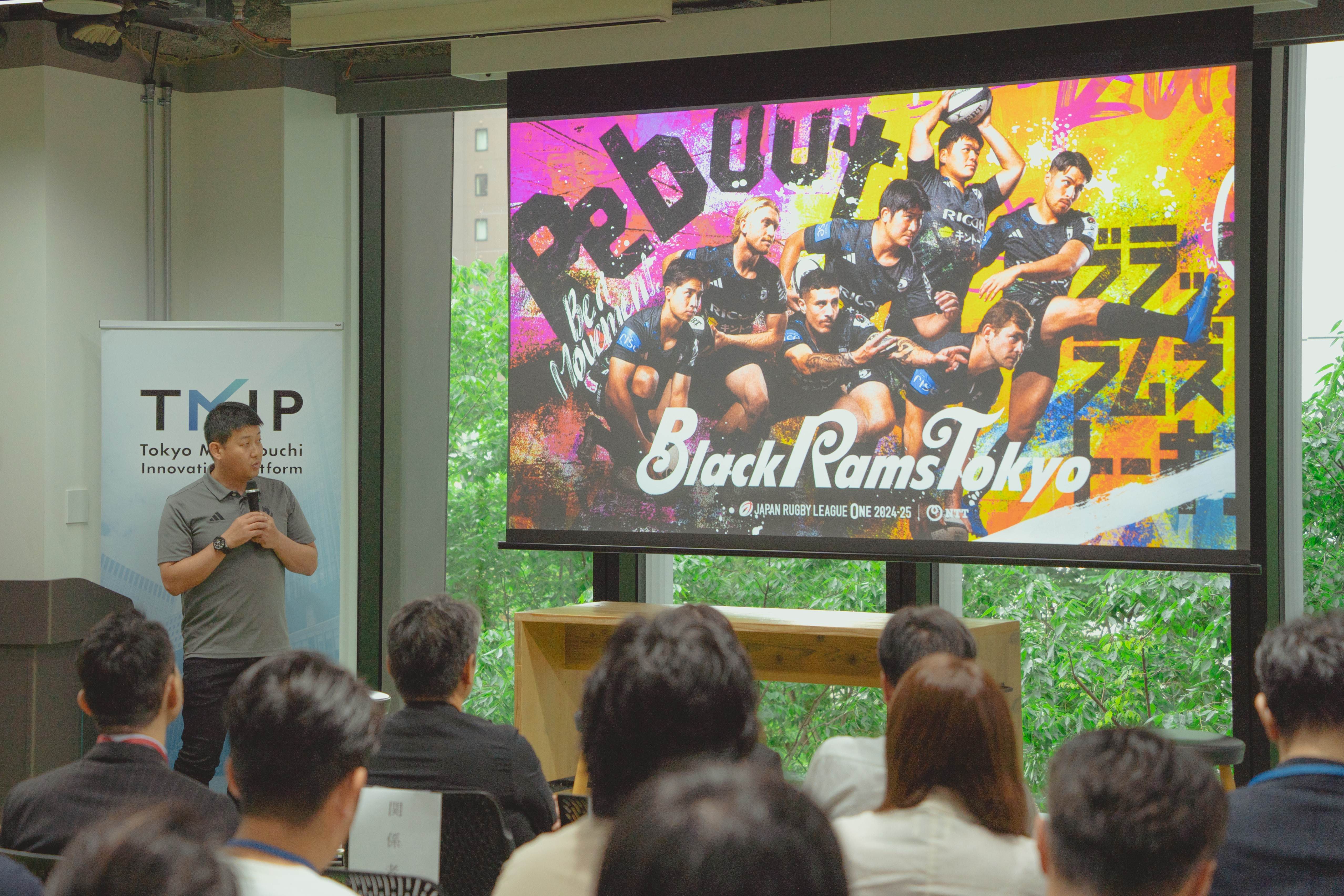 続いてマイクを握った白﨑氏は、こうした社会活動にスポーツチームとして積極的に関わる意義を強調します。昨年度、250回を超えるホームグラウンド活動(地域貢献活動)を実施したというブラックラムズ東京。その活動を通じて、社会課題の本質的な解決を目指していると言いますが、その活動には企業との連携が不可欠だと力を込めます。