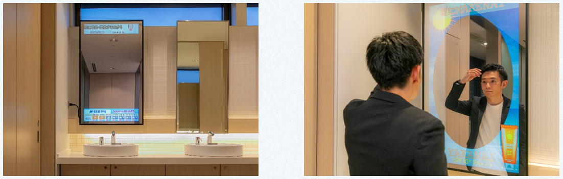プロジェクトが始動してからわずか半年後、新丸ビルのオフィスフロアのトイレに『ミラリア®』を設置し、その広告効果を検証するPoCを実施。化粧品会社の広告を配信するのみならず、天気予報やニュースなど、多様なコンテンツを表示しました。