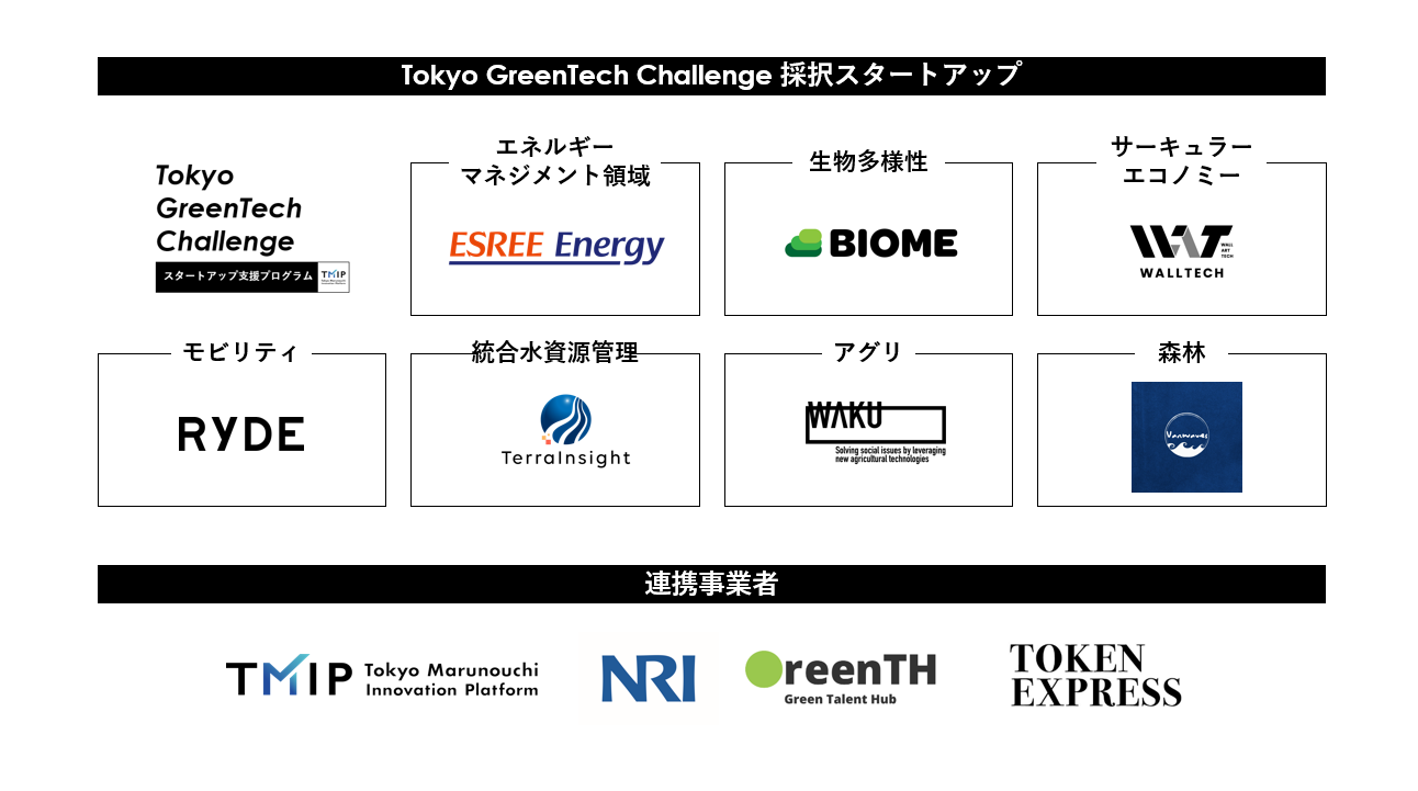 「東京から環境・エネルギー領域の社会課題解決スタートアップを全国・世界へ。 Tokyo GreenTech Challenge」は、スタートアップが最短距離で社会課題解決のインパクトを実現できるよう、 300団体を超えるTMIPコミュニティを活用し、「大企業・自治体等のプレイヤー集め」、「協調領域の抽出」、「実証費用・フィールド提供」など強力に伴走いたします。プログラムでは環境・エネルギー・気候変動分野でのスタートアップを採択した上で、TMIPコミュニティの大企業や自治体とチームを組成し、実装を見据えた実証実験などを実施します。あわせて、スタートアップの活動の紹介や広報活動も支援いたします。本プログラムにおいて、野村総合研究所は全体サポートや採択スタートアップのメンタリングや協業伴走を、グリーンタレントハブは採択スタートアップに対する人材採用支援やプロモーション支援を、トークンエクスプレスはインパクト測定及びインパクトレポートの作成を行います。