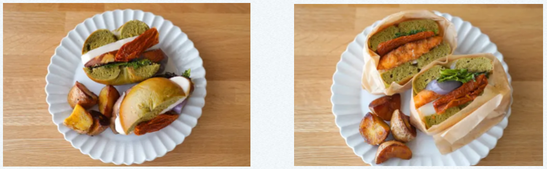 『MARUDELI』と開発した(左)【Vegan】 ベーグルサンド MUSHROOM(右)【Gluten Free】 ベーグルサンド FRIED SALMON