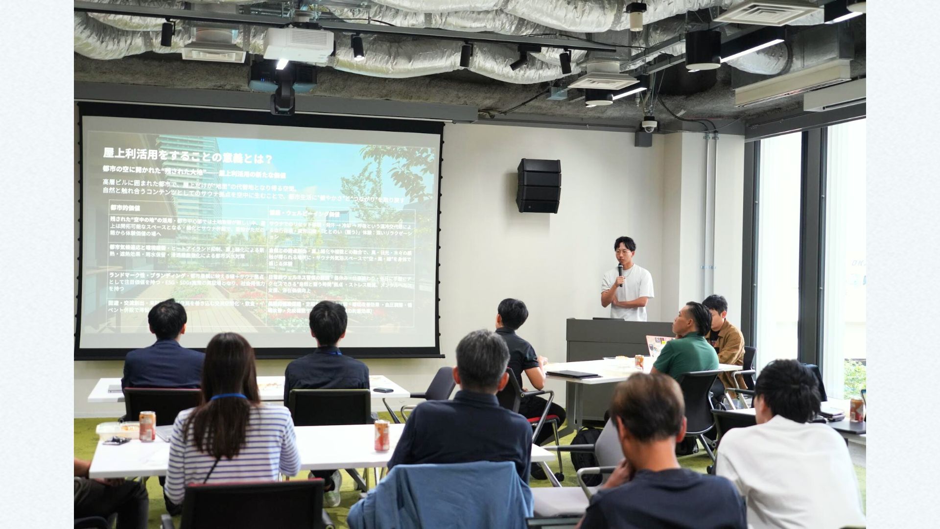 10月10日のランチ会で登壇したのは、株式会社Vanwavesの共同代表である木下雄斗氏。同社が展開するサウナ事業と、都市の屋上空間の活用を目指す同社の取り組み、そしてパートナーとして参画している株式会社yue 共同創業者/取締役 三浦燿氏を交え、 Tokyo GreenTech Challengeにおける「大手町エリアでの屋上サウナ運営」に関する実証実験の内容が語られました。