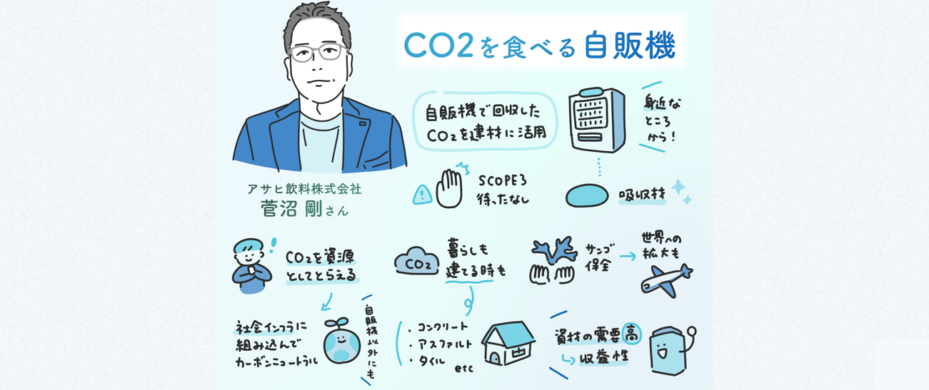 菅沼さん「しかし、我々にとっては大切な顧客接点であり、資産です。このネガティブな側面を、ポジティブな価値に変えることはできないか。そんな考えから生まれたのが、『CO₂を食べる自販機』と、それを起点にしたカーボンリサイクル事業の始まりでした」