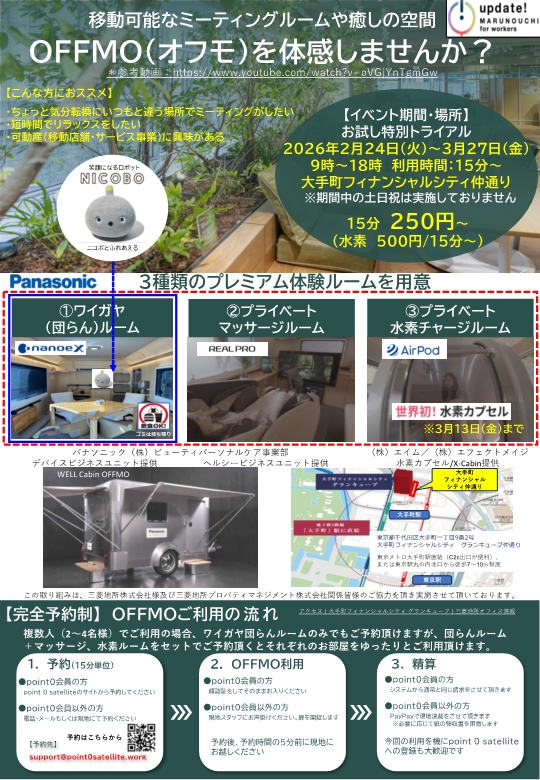 三菱地所株式会社(以下、三菱地所)、および大企業の新規事業創出支援や大企業とスタートアップ、産・官・学・街との連携で事業創出を目指すオープンイノベーションプラットフォームTokyo Marunouchi Innovation Platform(以下、TMIP)は、株式会社point0(以下、point0)、パナソニックオートモーティブシステムズ株式会社(以下、PAS)、パナソニック株式会社 エレクトリックワークス社(以下、EW)と連携し、移動設置可能なマルチパーパス空間「WELL Cabin OFFMO(オフモ)」を活用したサービス実証実験を、2026224日より大手町仲通りにて開始します。なお、本実証は「まちまるごと実証実験 by TMIP」の取り組みの一つです。